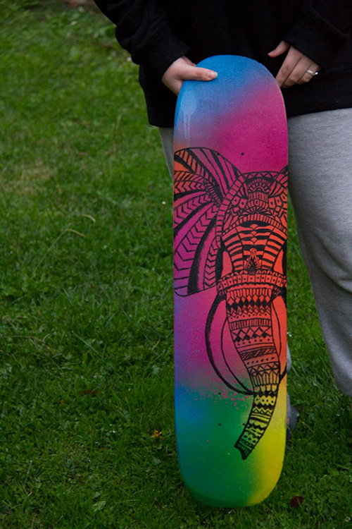 Some of her most popular pieces are her custom skateboard decks and tables. She paints the artwork on the surface and then coats it in a protective sealant. The designs range from whimsical to beautiful, depending on the personality of the individual commissioning the work and the purpose of the piece.